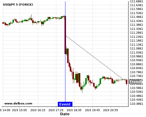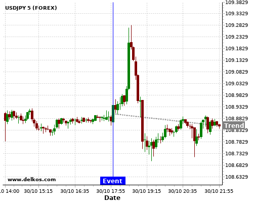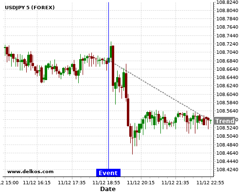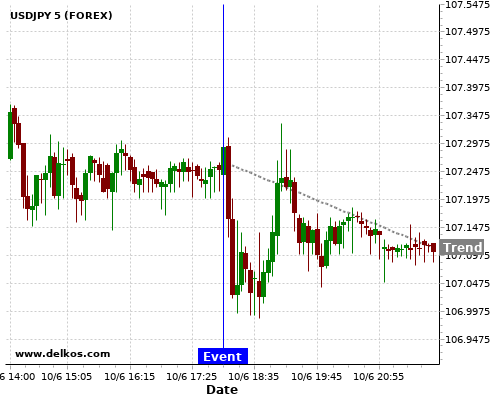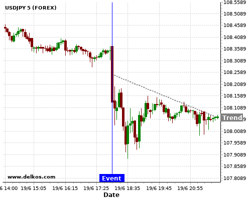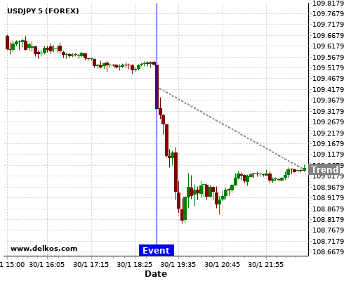 这个可能性是根据最近12次公布US Fed Interest Rate Decision数据得出的,12次中有12次真实数据等于专家预期,这其中有8次导致USDJPY下跌。