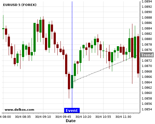 如果该数据大于专家预期,那么EURUSD在消息公布之后的四小时内,将有80%的可能性会上涨。