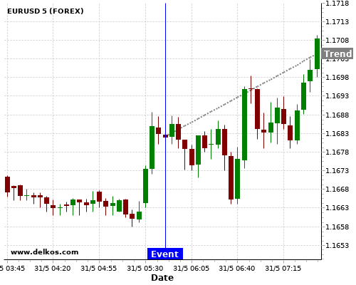 这个可能性是根据最近12次公布CH GDP Growth Rate QoQ数据得出的,12次中有7次真实数据大于专家预期,这其中有4次导致EURUSD上涨。