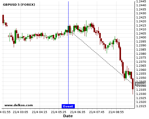 如果该数据小于专家预期,那么GBPUSD在消息公布之后的四小时内,将有71.42%的可能性会下跌。