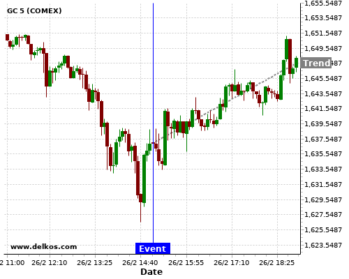 This probability is based on the last 12 US New Home Sales events, in which 5 of the last 10 events where the actual number was greater than than the economist consensus resulted in an up trend of GC.