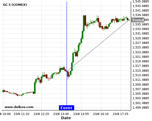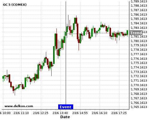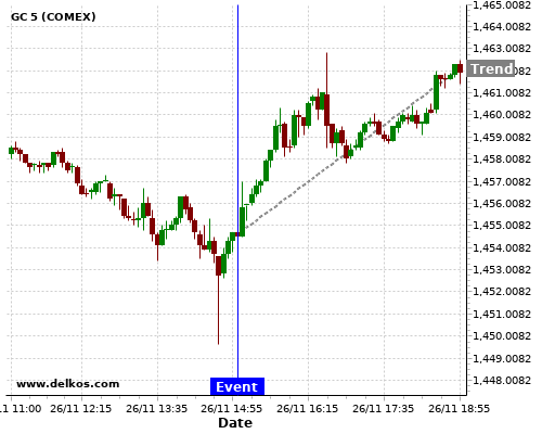This probability is based on the last 12 US New Home Sales events, in which 5 of the last 10 events where the actual number was greater than than the economist consensus resulted in an up trend of GC.