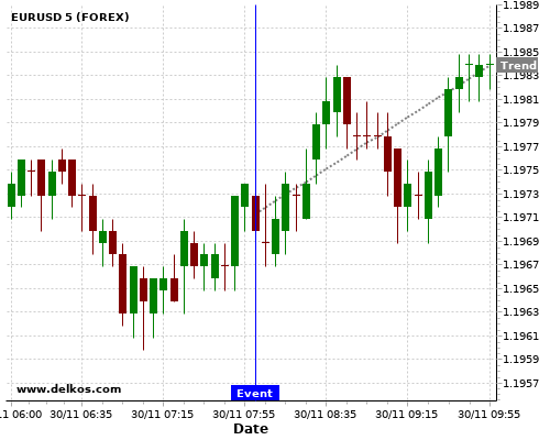 Эта вероятность основывается на последних 12 новостных событиях CH KOF Leading Indicators, во время которых в 5 из 7 случаев, когда фактическое значение показателя было Выше чем консенсус экономистов – будет расти EURUSD.