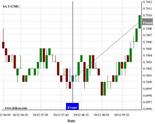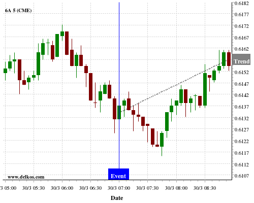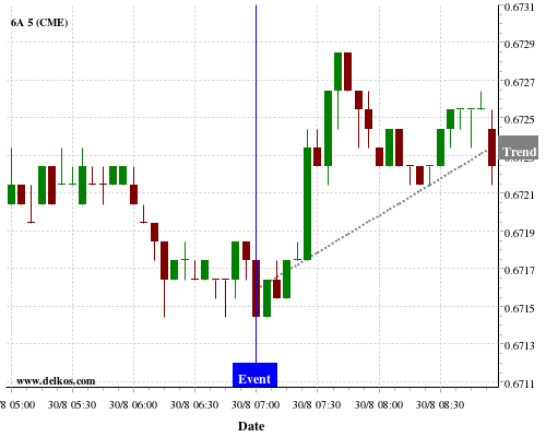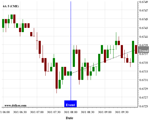 If the number is greater than than economists’ consensus there is a 71.42% probability that 6A will trend up following the news event.
