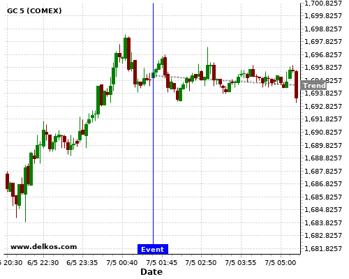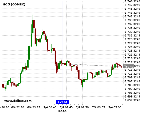 This probability is based on the last 12 AU Balance of Trade events, in which 5 of the last 7 events where the actual number was greater than than the economist consensus resulted in an down trend of GC.