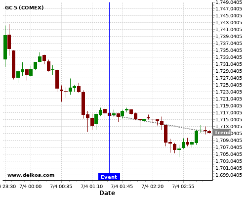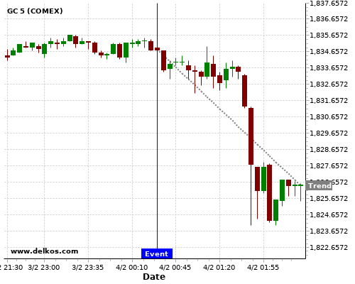 This probability is based on the last 12 AU Balance of Trade events, in which 5 of the last 7 events where the actual number was greater than than the economist consensus resulted in an down trend of GC.