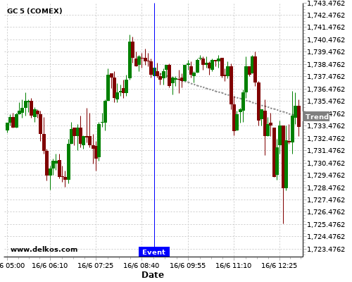 This probability is based on the last 12 DE ZEW Economic Sentiment Index events, in which 5 of the last 7 events where the actual number was greater than than the economist consensus resulted in an down trend of GC.