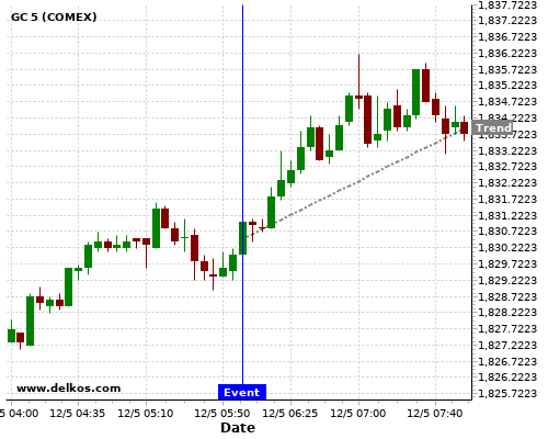 This probability is based on the last 12 GB Balance of Trade events, in which 5 of the last 7 events where the actual number was greater than than the economist consensus resulted in an up trend of GC.