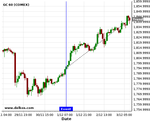 This probability is based on the last 12 DE Unemployment Rate events, in which 5 of the last 7 events where the actual number was less than than the economist consensus resulted in an up trend of GC.