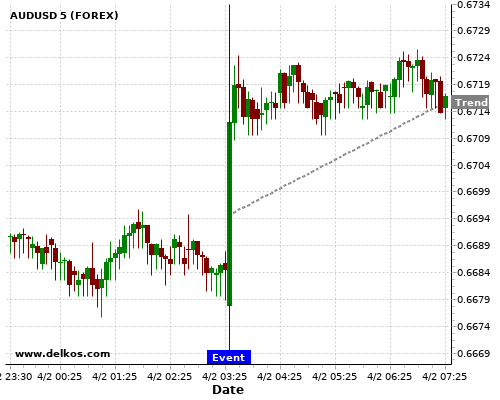 This probability is based on the last 12 AU RBA Interest Rate Decision events, in which 8 of the last 11 events where the actual number was equal to than the economist consensus resulted in an up trend of AUDUSD.