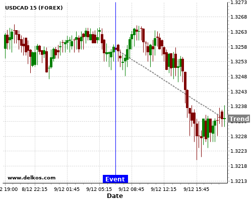 This probability is based on the last 12 DE Balance of Trade events, in which 8 of the last 11 events where the actual number was greater than than the economist consensus resulted in an down trend of USDCAD.