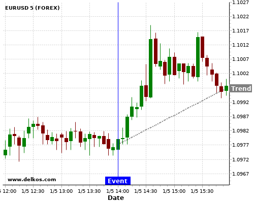 If the number is greater than than economists’ consensus there is a 75% probability that EURUSD will trend up following the news event.