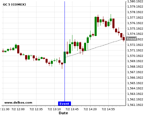 DELKOS 75% probability that GC will trend up on Friday 09 Oct at 12:30 PM GMT if the CA Employment Change number is greater than 156.6K.