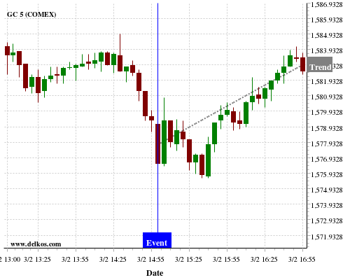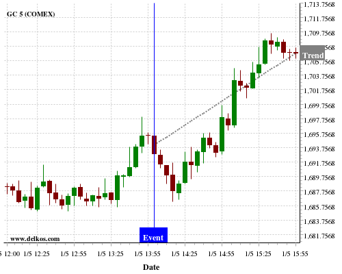 This probability is based on the last 12 US ISM Manufacturing PMI events, in which 3 of the last 4 events where the actual number was greater than than the economist consensus resulted in an up trend of GC.