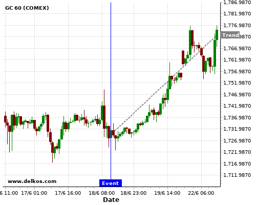 This probability is based on the last 12 US Philadelphia Fed Manufacturing Index events, in which 6 of the last 8 events where the actual number was greater than than the economist consensus resulted in an up trend of GC.