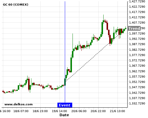 This probability is based on the last 12 US Fed Interest Rate Decision events, in which 9 of the last 12 events where the actual number was equal to than the economist consensus resulted in an up trend of GC.