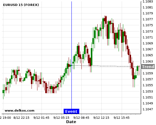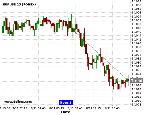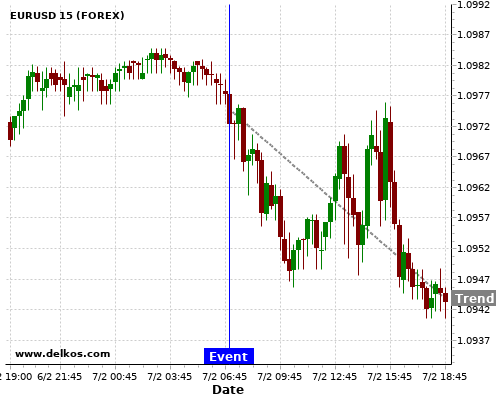 Эта вероятность основывается на последних 12 новостных событиях DE Balance of Trade, во время которых в 4 из 9 случаев, когда фактическое значение показателя было Выше чем консенсус экономистов – будет падать EURUSD.
