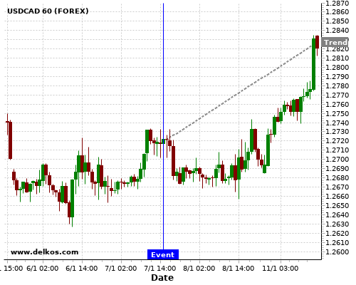 Если показатель Выше чем консенсус экономистов существует 77.77% вероятность того, что USDCAD будет расти после новостного события.