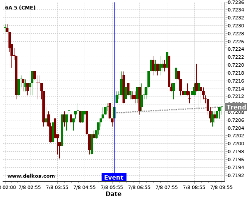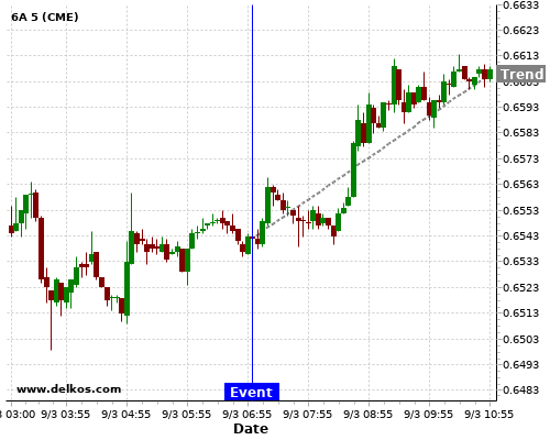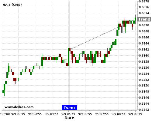 This probability is based on the last 12 DE Balance of Trade events, in which 5 of the last 9 events where the actual number was greater than than the economist consensus resulted in an up trend of 6A.