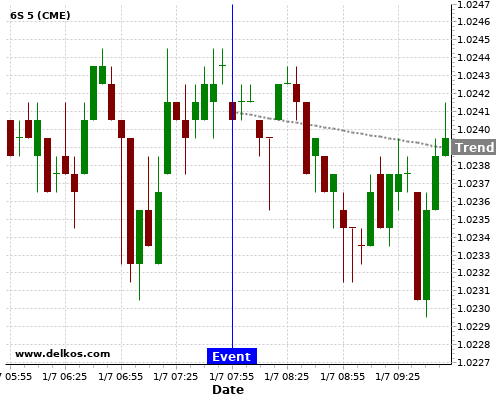 This probability is based on the last 12 DE Unemployment Rate events, in which 7 of the last 9 events where the actual number was equal to than the economist consensus resulted in an down trend of 6S.