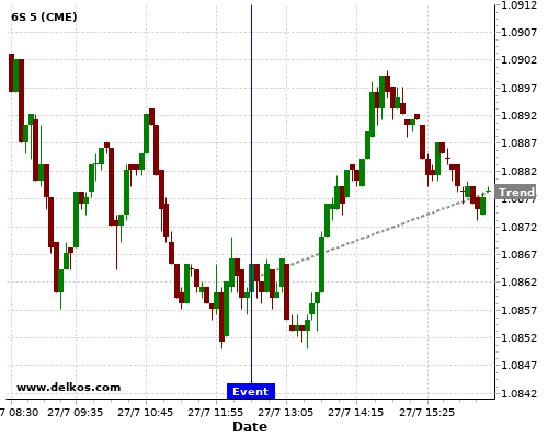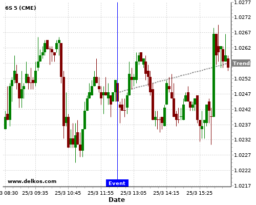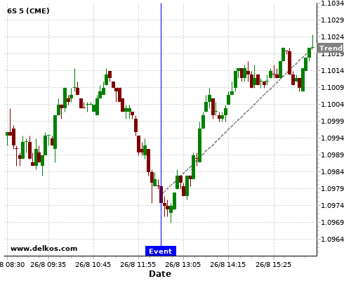 This probability is based on the last 12 US Durable Goods Orders MoM events, in which 7 of the last 9 events where the actual number was greater than than the economist consensus resulted in an up trend of 6S.