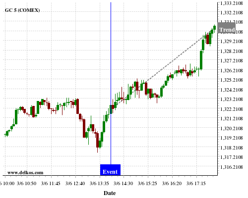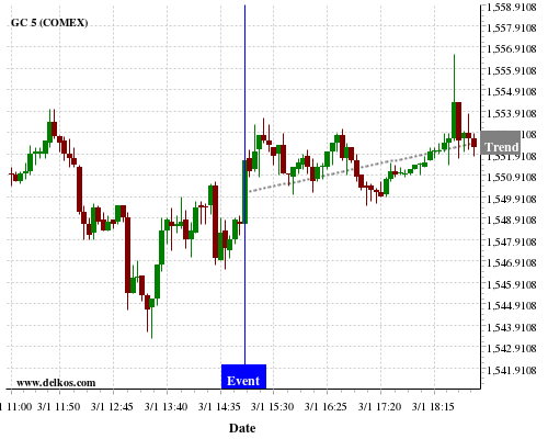 This probability is based on the last 12 US ISM Manufacturing PMI events, in which 7 of the last 9 events where the actual number was less than than the economist consensus resulted in an up trend of GC.