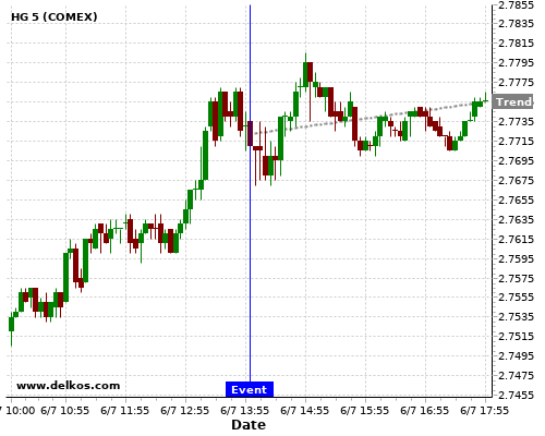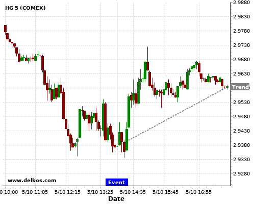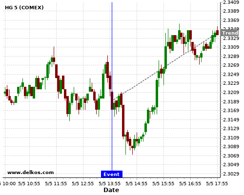 This probability is based on the last 12 US ISM Non-Manufacturing PMI events, in which 7 of the last 9 events where the actual number was greater than than the economist consensus resulted in an up trend of HG.