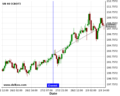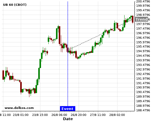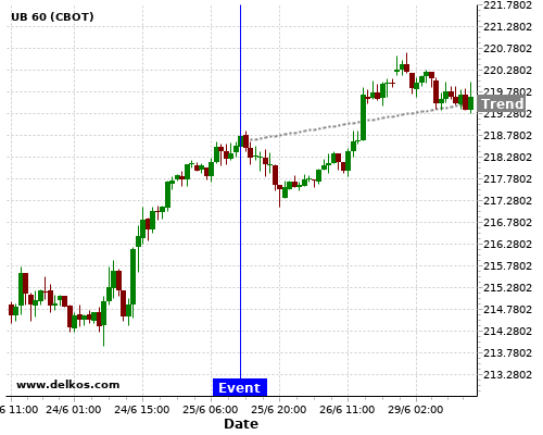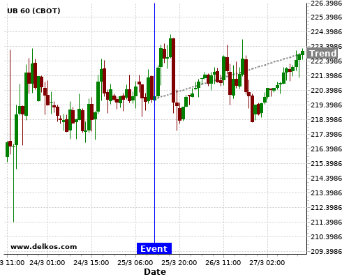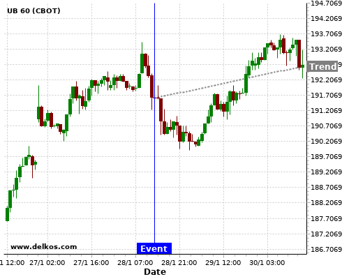 This probability is based on the last 12 US Durable Goods Orders MoM events, in which 5 of the last 9 events where the actual number was greater than than the economist consensus resulted in an up trend of UB.