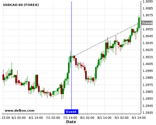 If the number is greater than than economists’ consensus there is a 77.77% probability that USDCAD will trend up following the news event.