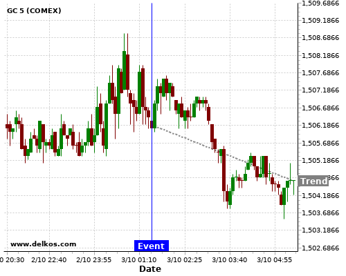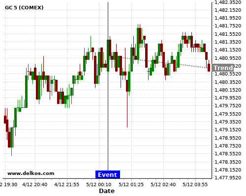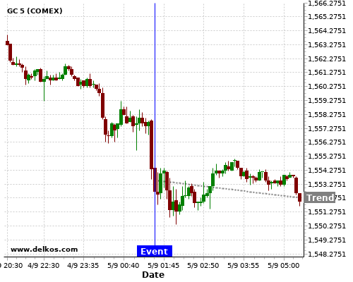 This probability is based on the last 12 AU Balance of Trade events, in which 4 of the last 5 events where the actual number was less than than the economist consensus resulted in an down trend of GC.