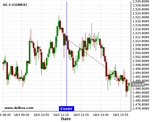 This probability is based on the last 12 US Housing Starts events, in which 2 of the last 6 events where the actual number was greater than than the economist consensus resulted in an down trend of GC.