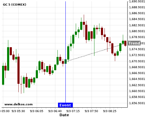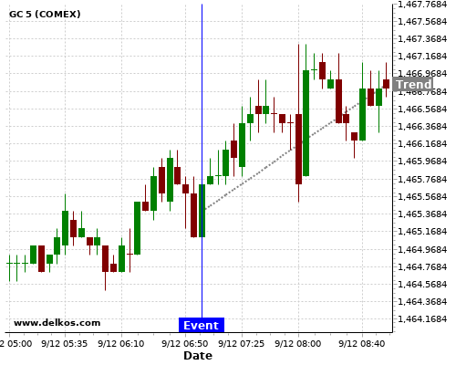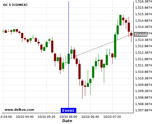 This probability is based on the last 12 DE Balance of Trade events, in which 8 of the last 10 events where the actual number was greater than than the economist consensus resulted in an up trend of GC.