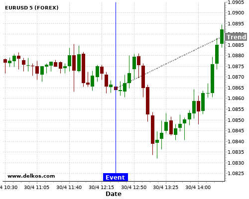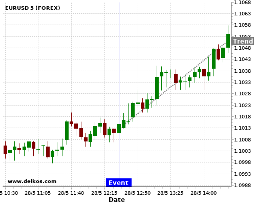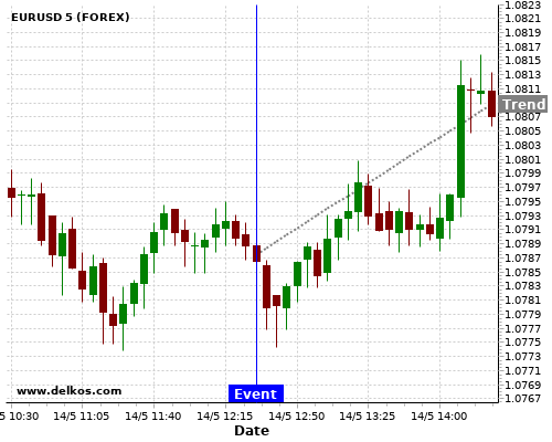 Эта вероятность основывается на последних 12 новостных событиях US Continuing Jobless Claims, во время которых в 5 из 6 случаев, когда фактическое значение показателя было меньше чем консенсус экономистов – будет расти EURUSD.