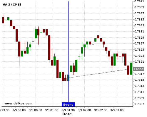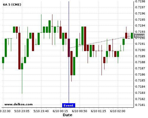 This probability is based on the last 12 AU Balance of Trade events, in which 5 of the last 6 events where the actual number was less than than the economist consensus resulted in an up trend of 6A.