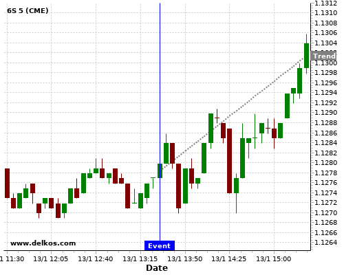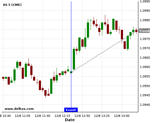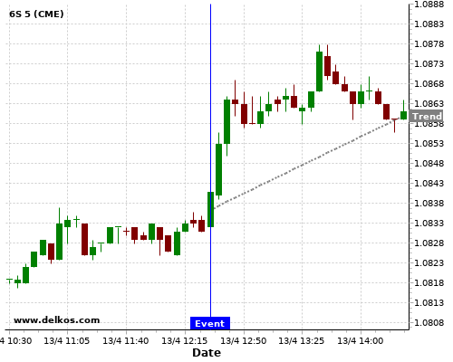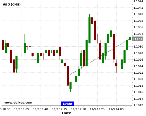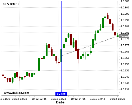 This probability is based on the last 12 US Inflation Rate YoY events, in which 5 of the last 6 events where the actual number was greater than than the economist consensus resulted in an up trend of 6S.