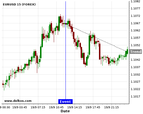 This probability is based on the last 12 US Philadelphia Fed Manufacturing Index events, in which 5 of the last 6 events where the actual number was greater than than the economist consensus resulted in an down trend of EURUSD.