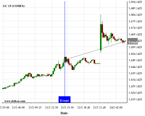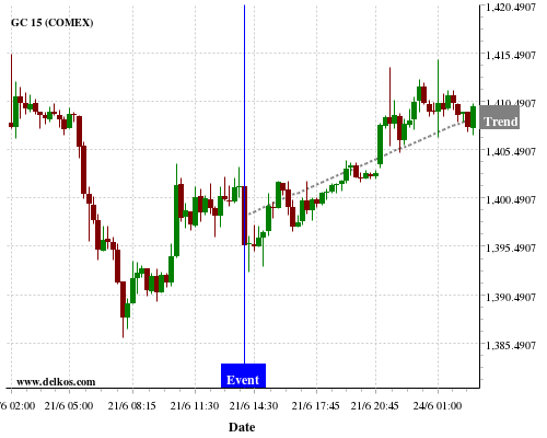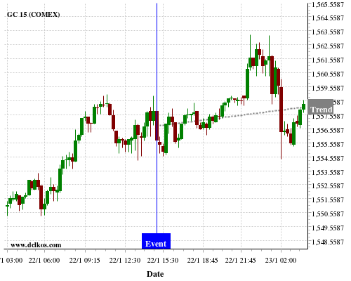 This probability is based on the last 12 US Existing Home Sales events, in which 5 of the last 6 events where the actual number was greater than than the economist consensus resulted in an up trend of GC.