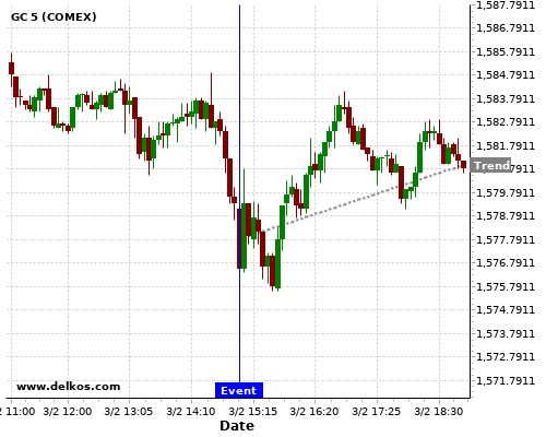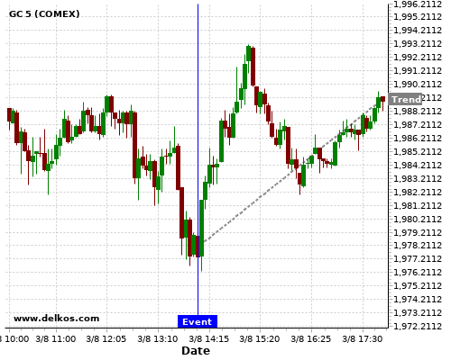 This probability is based on the last 12 US ISM Manufacturing PMI events, in which 5 of the last 6 events where the actual number was greater than than the economist consensus resulted in an up trend of GC.