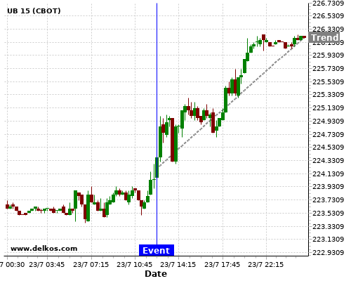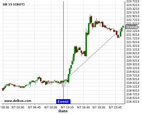 This probability is based on the last 12 US Continuing Jobless Claims events, in which 2 of the last 6 events where the actual number was less than than the economist consensus resulted in an up trend of UB.