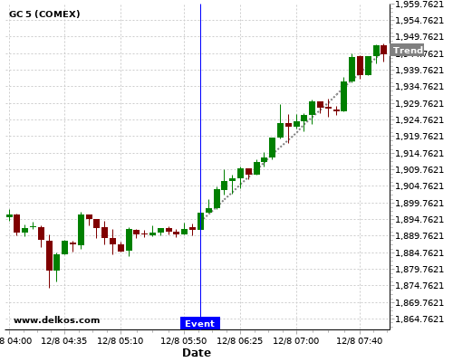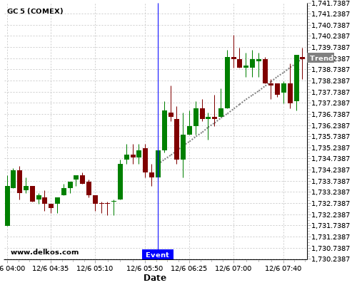 This probability is based on the last 12 GB Balance of Trade events, in which 6 of the last 8 events where the actual number was greater than than the economist consensus resulted in an up trend of GC.