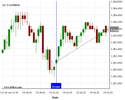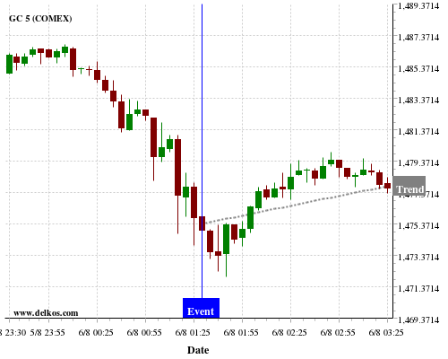 This probability is based on the last 12 AU Balance of Trade events, in which 6 of the last 7 events where the actual number was greater than than the economist consensus resulted in an up trend of GC.