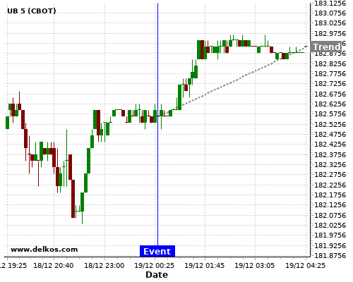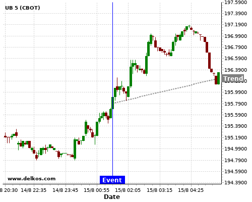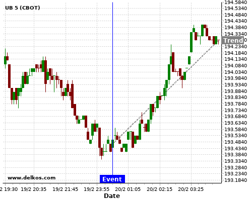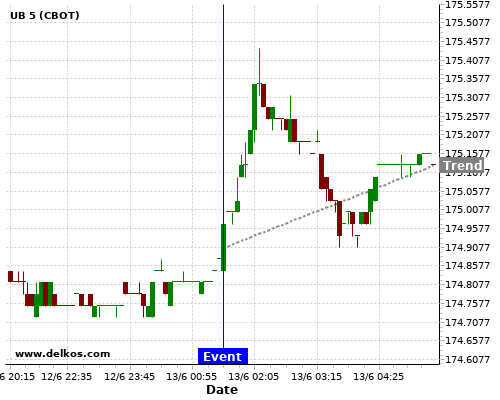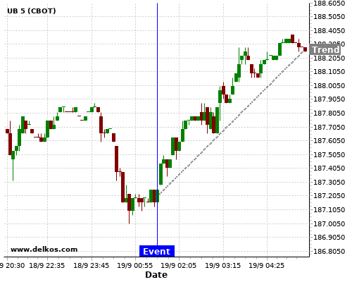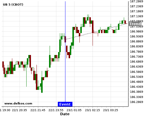 This probability is based on the last 12 AU Employment Change events, in which 7 of the last 8 events where the actual number was greater than than the economist consensus resulted in an up trend of UB.