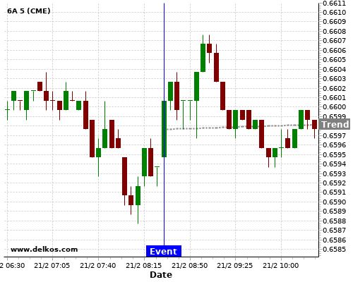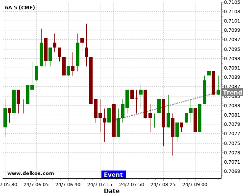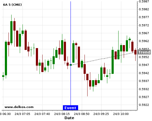 This probability is based on the last 12 DE Markit Manufacturing PMI Flash events, in which 3 of the last 7 events where the actual number was greater than than the economist consensus resulted in an up trend of 6A.