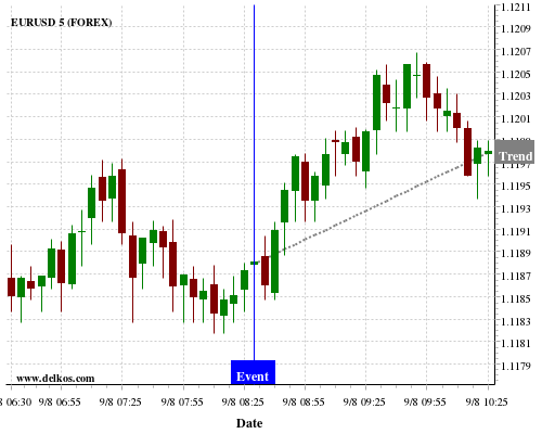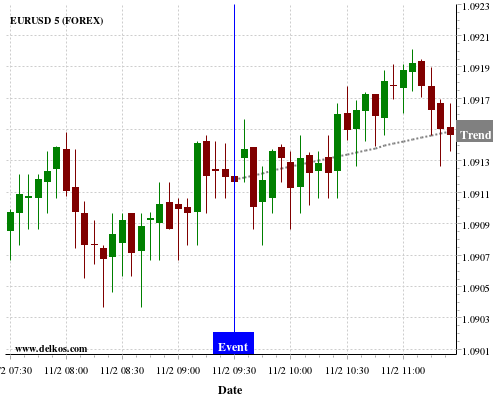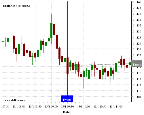This probability is based on the last 12 GB Balance of Trade events, in which 5 of the last 7 events where the actual number was greater than than the economist consensus resulted in an up trend of EURUSD.
