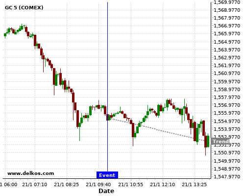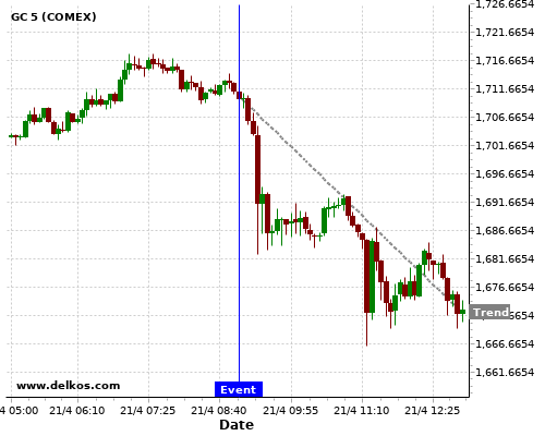 This probability is based on the last 12 DE ZEW Economic Sentiment Index events, in which 5 of the last 7 events where the actual number was greater than than the economist consensus resulted in an down trend of GC.