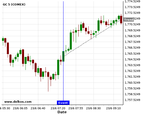 This probability is based on the last 12 DE Markit Manufacturing PMI Flash events, in which 5 of the last 8 events where the actual number was greater than than the economist consensus resulted in an up trend of GC.