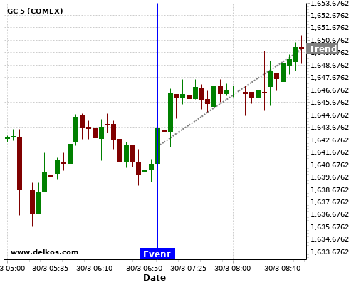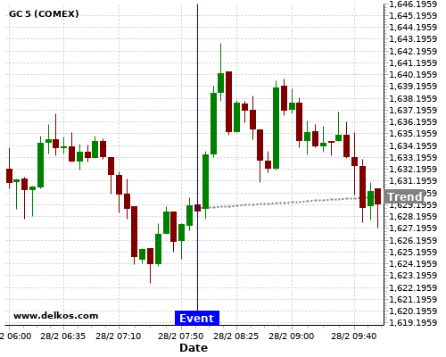 This probability is based on the last 12 CH KOF Leading Indicators events, in which 4 of the last 7 events where the actual number was greater than than the economist consensus resulted in an up trend of GC.