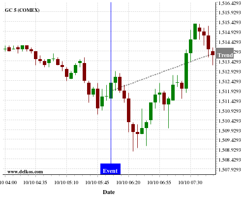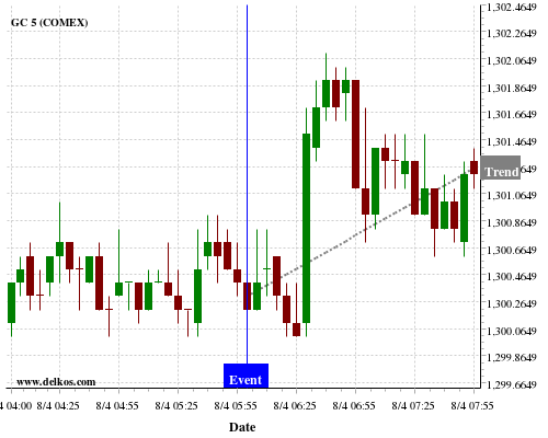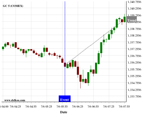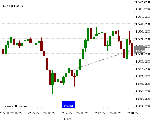 This probability is based on the last 12 DE Balance of Trade events, in which 8 of the last 11 events where the actual number was greater than than the economist consensus resulted in an up trend of GC.