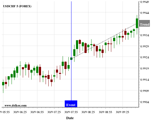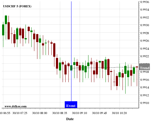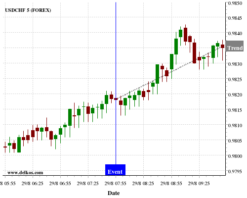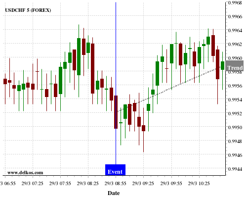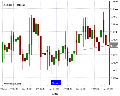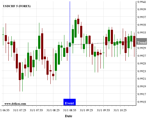 This probability is based on the last 12 DE Unemployment Rate events, in which 8 of the last 11 events where the actual number was equal to than the economist consensus resulted in an up trend of USDCHF.
