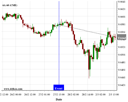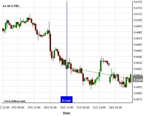 This probability is based on the last 12 US Continuing Jobless Claims events, in which 2 of the last 3 events where the actual number was greater than than the economist consensus resulted in an down trend of 6A.